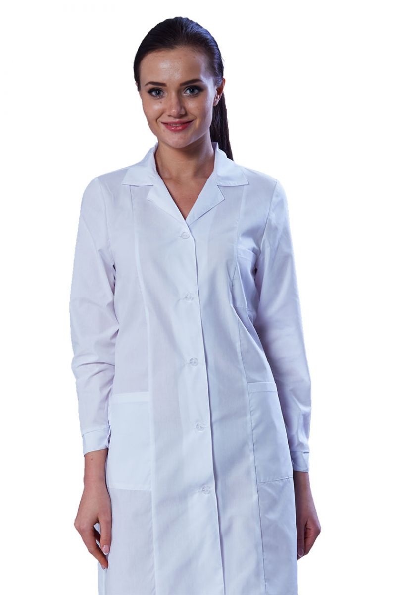 Халат с центральной бортовой застежкой на пуговицы. С одним нагрудным накладным и двумя нижними карманами. Женский халат с рельефными швами. Спинка со средним швом, с поясом, втачанным в боковые швы.