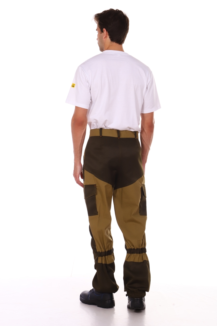 ➠ Брюки с цельнокроеным поясом, застегиваются на петлю и пуговицу. На верхних частях передних половинок расположены верхние накладные карманы и нижние накладные карманы с фигурными клапанами на пуговицах. Нижние карманы с объемом с одной стороны и переходят на задние половинки.