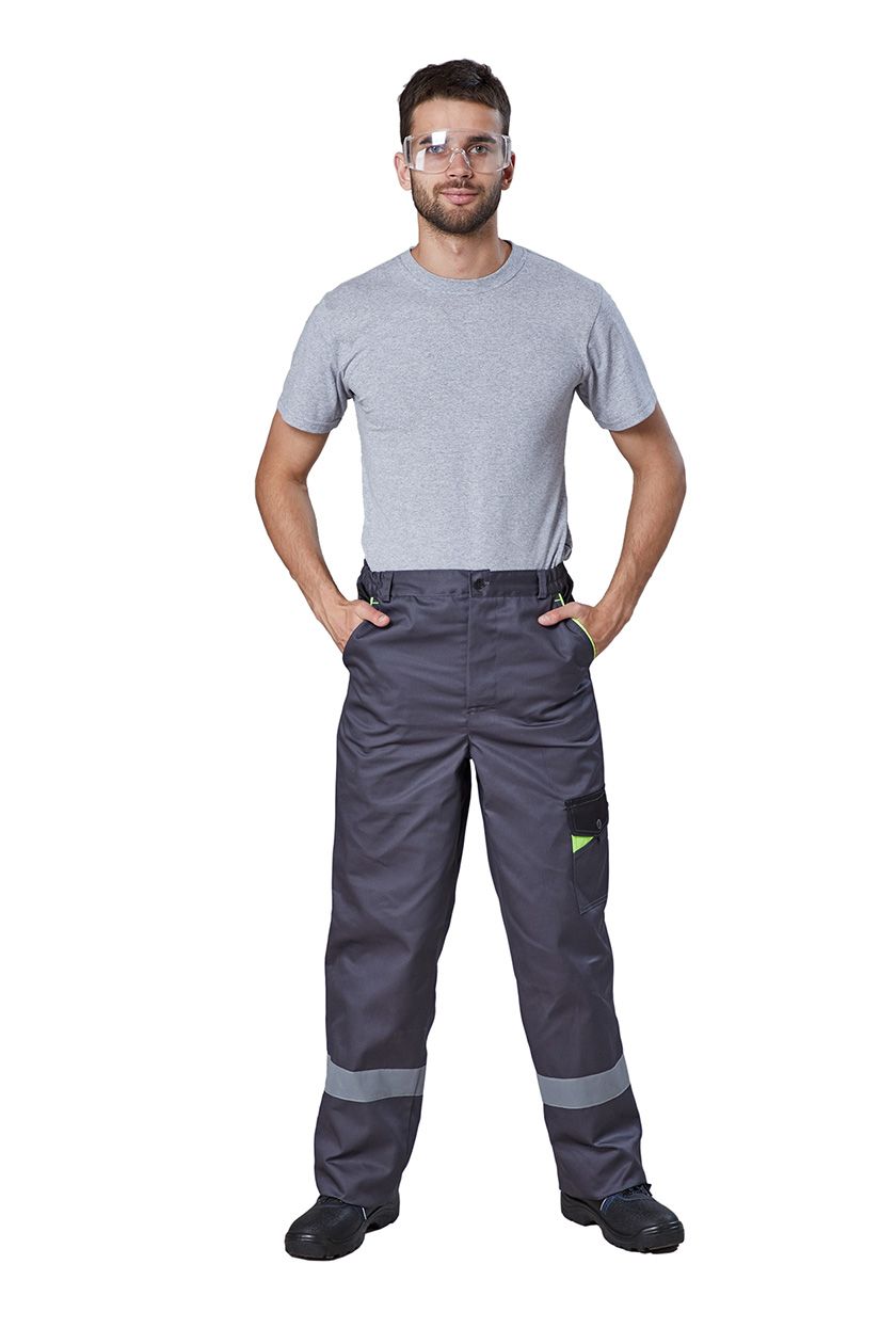 Брюки мужские прямого кроя, с застёжкой гульфика на молнию. Притачной пояс с резинкой по бокам и шлевками. Накладные карманы на левом боковом шве с клапаном с патой на кнопке. Два задних накладных кармана и карман для инструментов.