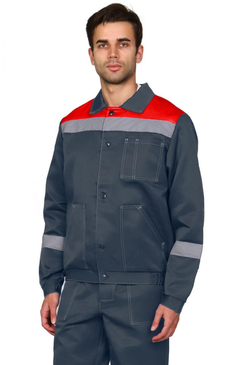 ➠ Куртка серая с красной кокеткой укороченная, пояс притачной. Центральная застежка на петли и пуговицы. Воротник отложной. Накладной карман на груди с отделением для ручки. Нижние накладные карманы с наклонным входом.